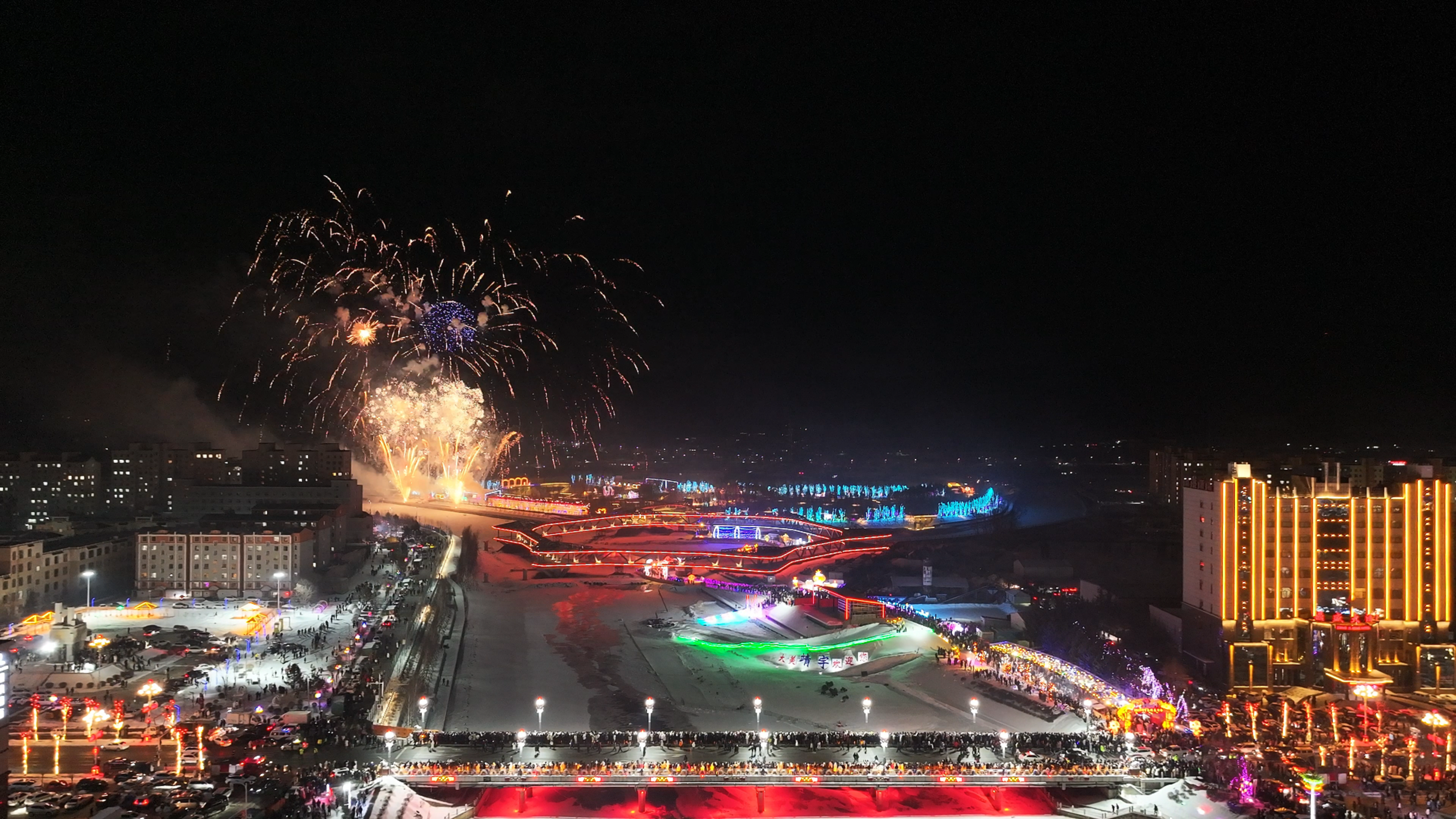 随着一声声礼炮响起,高、中、低空烟花同步燃放,各种造型的烟花在夜空中绽放,炫彩夺目,美轮美奂。当天晚上,持续半小时的烟花秀将整个元宵佳节活动推向高潮。“火树银花不夜天”的壮美景观让人叹为观止,群众们纷纷驻足观赏,感受节日的浪漫与喜悦。