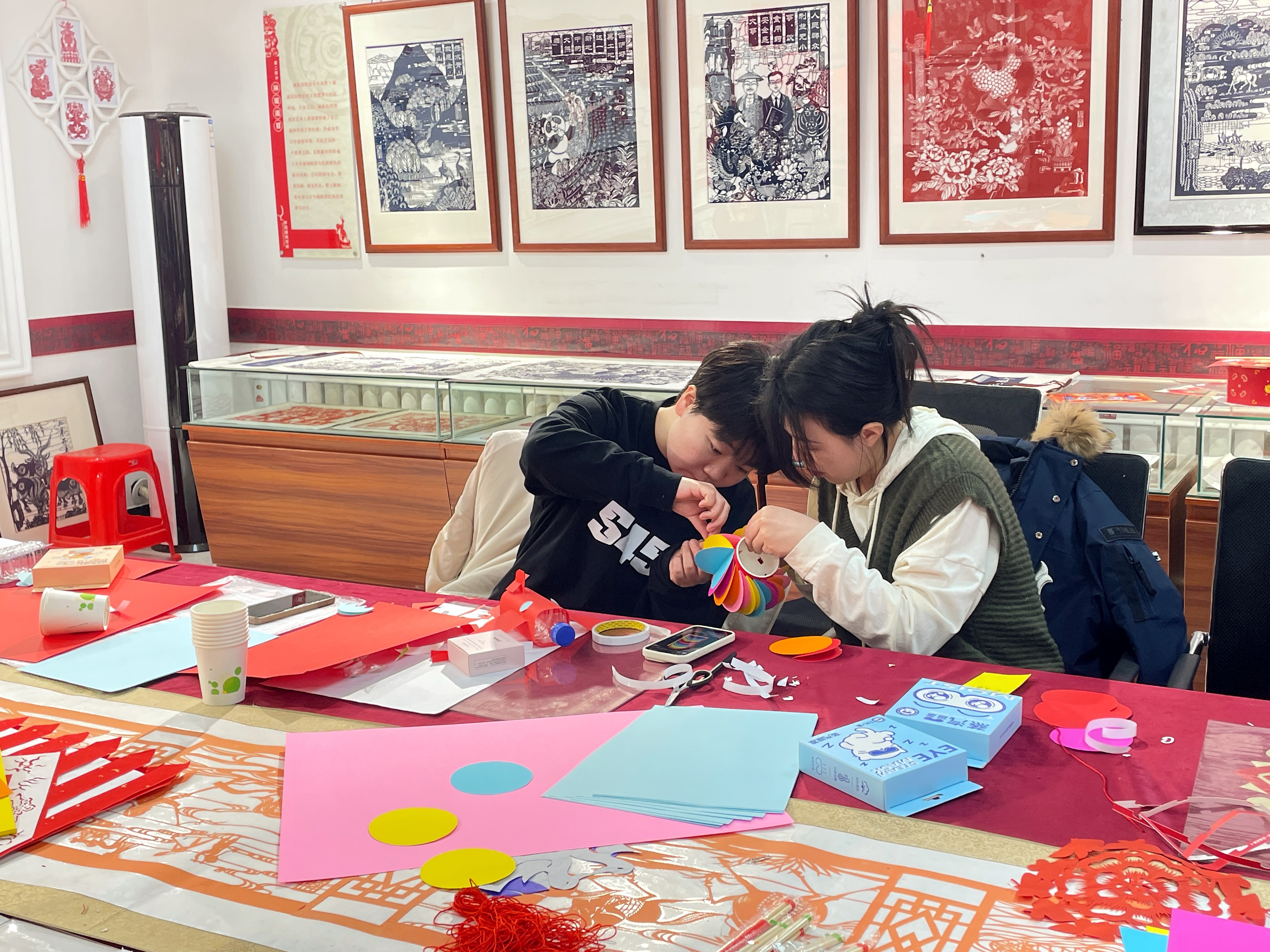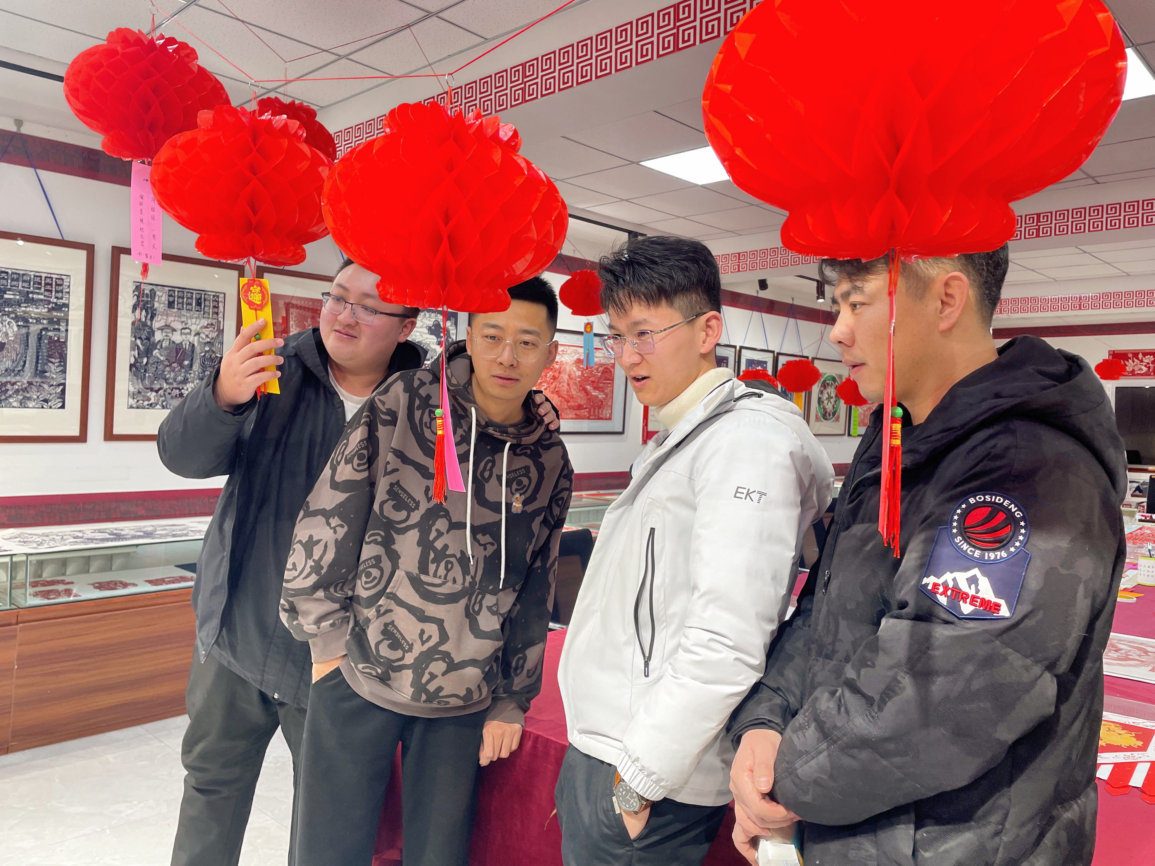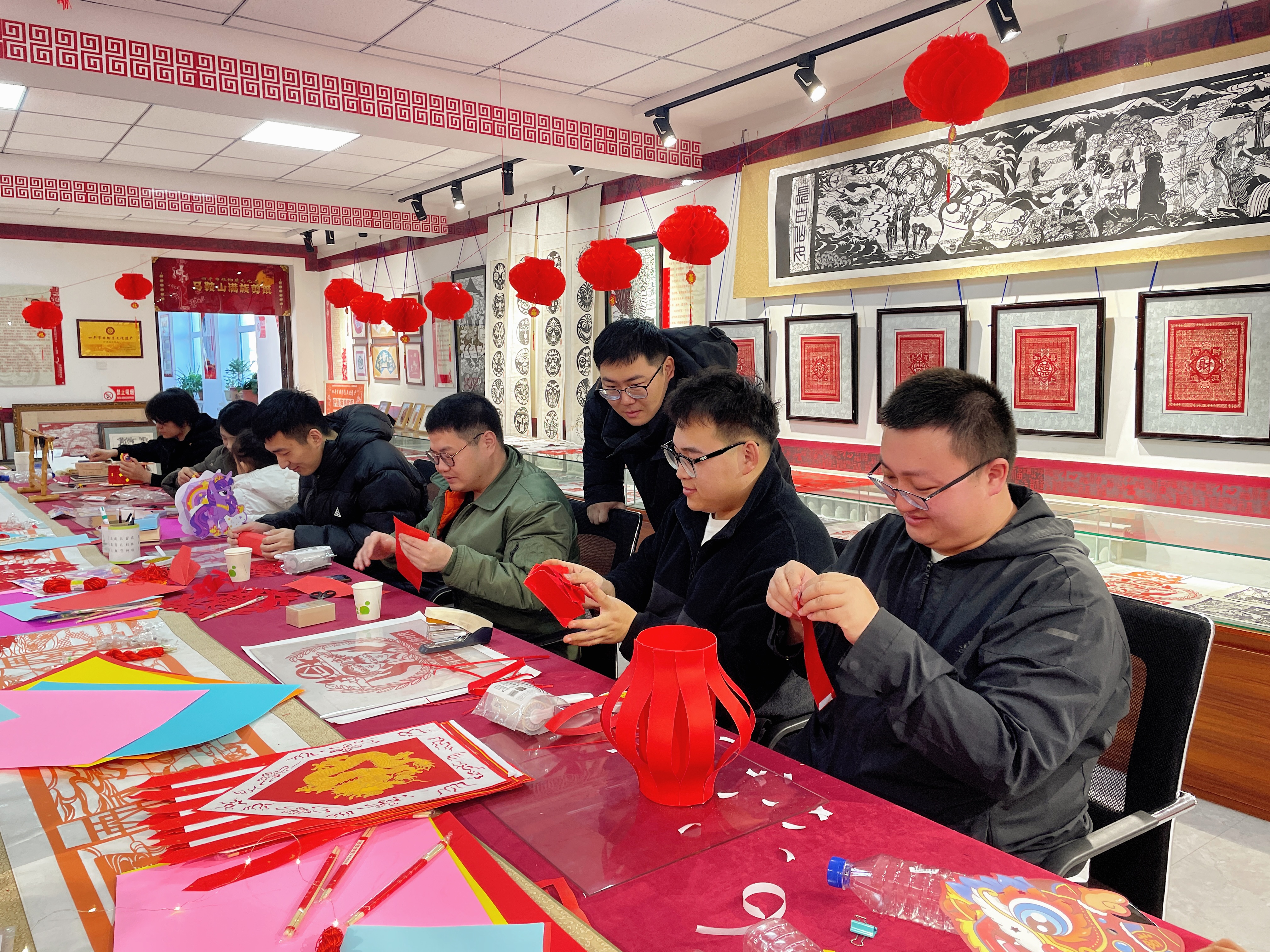 在DIY制作灯笼区域,摆放着各式各样的制作材料。大家小心翼翼、认认真真地进行折叠、粘贴、组装,一步步将材料变成了一盏盏造型独特的灯笼,兴高采烈地拿着自己制作的花灯展示。