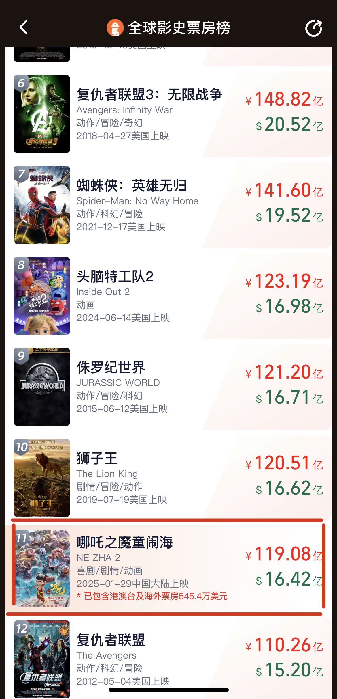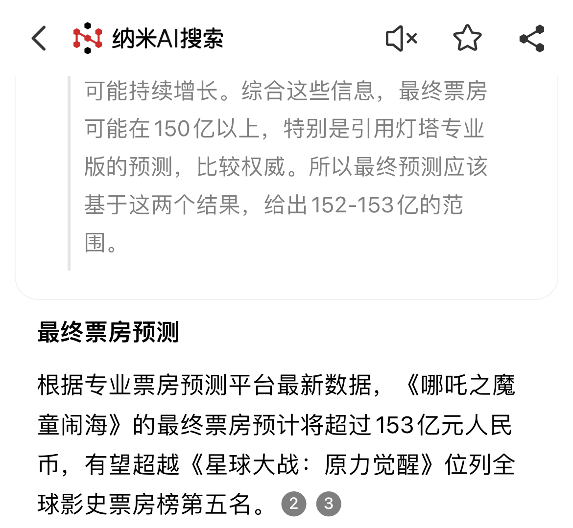 纳米AI则精准预判,《哪吒2》的票房将到达153亿人民币,最终排名世界电影票房排行榜第五名。
