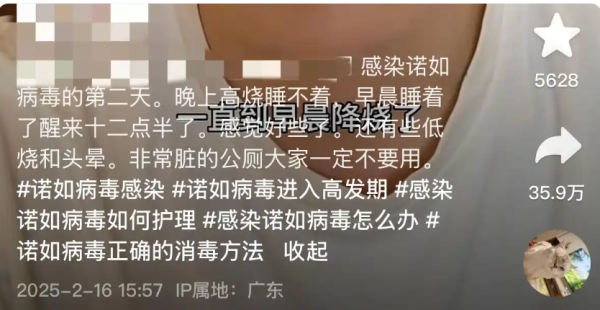 2月16日,广东一男子发帖表示,妻子在2月15日上完公厕后疑似感染了诺如病毒。由于女厕排队,妻子进入一个没冲干净的坑位,且没戴口罩在里面停留了几分钟,出来后不久便出现轻微干呕,而同行的自己也于几小时后开始发烧。