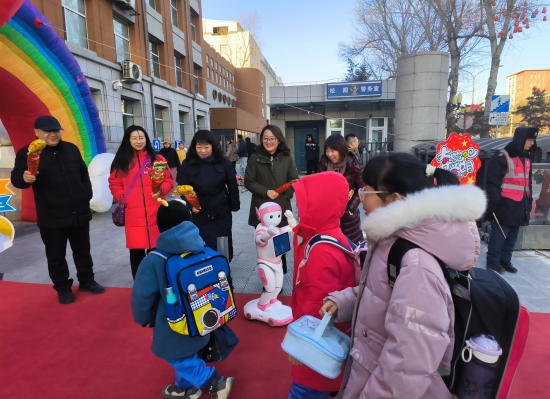 一进校门,同学们瞬间就被吸引住了,鲜红的地毯、别致的拱门,更吸引眼球的是两个憨态可鞠的机器人正热情地跟同学们打招呼,引得大家纷纷驻足互动。