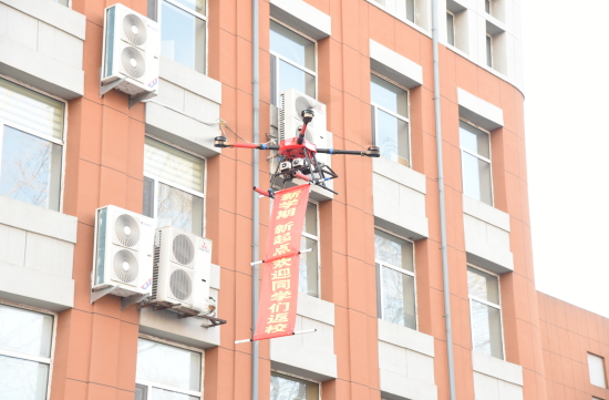 无人机社团的师生们也早早到校,腾空而起的大型无人机悬挂着鲜艳的条幅——“于成长中淬炼,向卓越处启航”,“新学期,新起点,欢迎同学们返校!”科技与热情交织,瞬间点燃了同学们对新学期的期待与向往,更激发了他们对科技探索的无限兴趣。