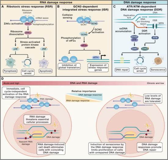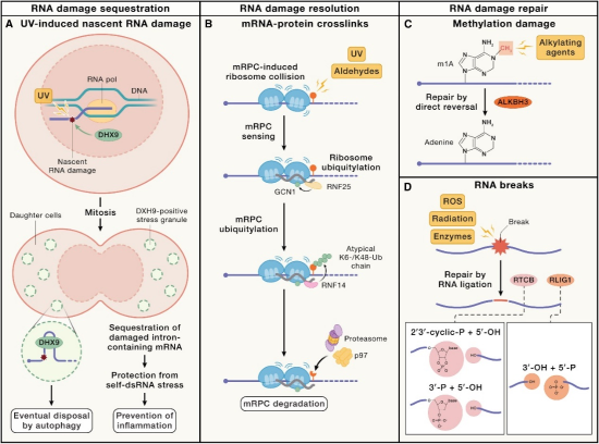 赵书博团队通过整合近年研究成果,系统性地总结了RNA损伤应答领域的最新研究进展,围绕RNA损伤的来源与类型、RNA损伤诱导的细胞应答反应及修复机制等方面展开深入探讨,强调了RNA稳定性及RNA损伤应答在人体健康中的重要作用。作者在文章中提出,RNA损伤应答具有两大关键功能:一是在严重核酸损伤条件下,RNA损伤应答通过修复受损RNA分子,从而维持细胞的短暂功能;二是RNA损伤的检测可作为DNA损伤的预警信号,为细胞损伤修复提供前期准备。这些研究不仅拓展了人们对RNA损伤应答机制的理解,也为相关疾病的治疗提供了新的视角。