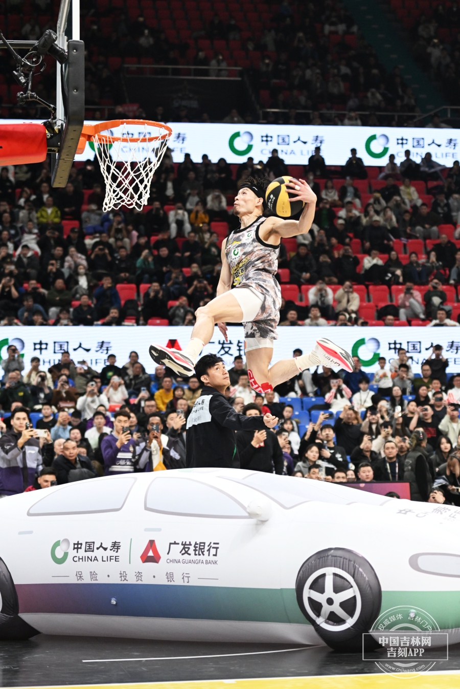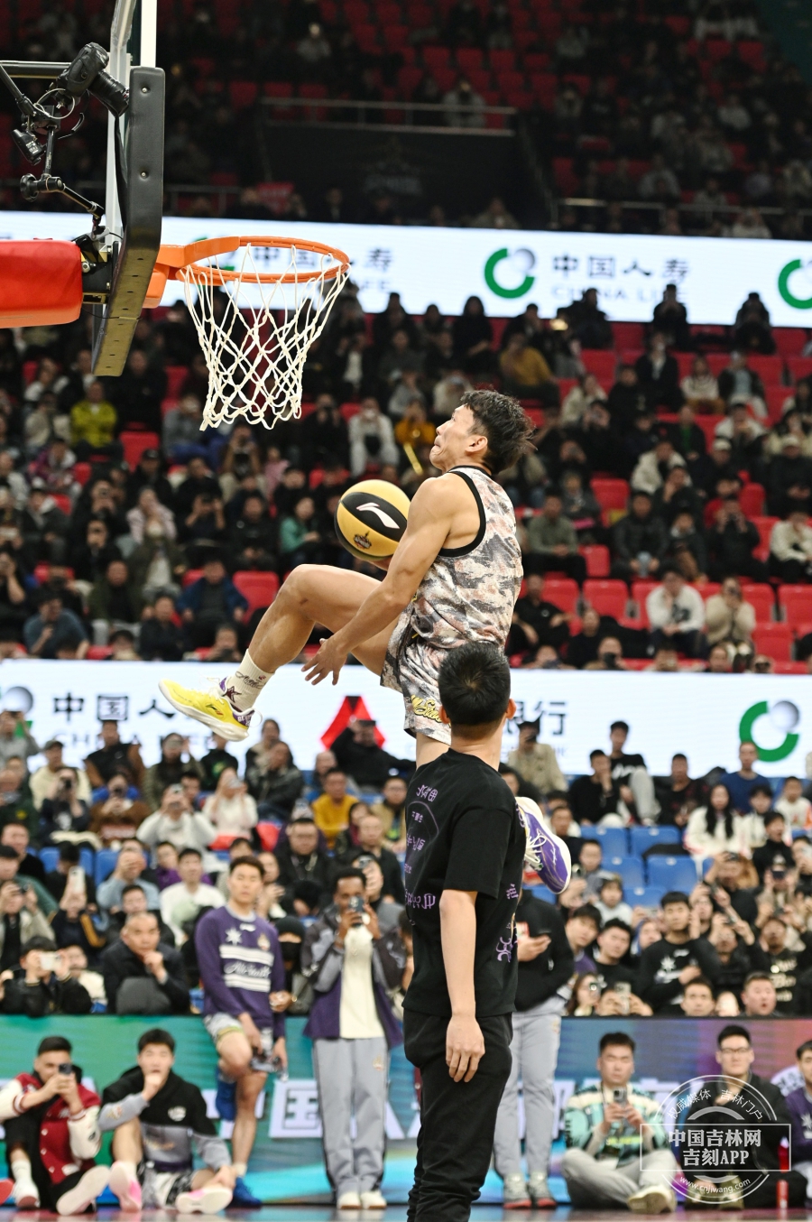外卡选手陈登星滑翔飞越五人单臂抡扣,夺得50分的满分