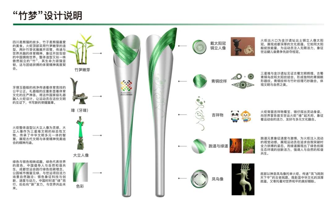 此次世运会将于2025年8月7日—8月17日在成都举行,而备受瞩目的火炬“竹梦”,设计巧思令人赞叹。它的造型提取自三星堆出土的青铜大立人像身形,又宛如一株傲然挺立的“竹”,寓意“逐梦”,与火炬传递口号“牵手世运,点燃梦想”相呼应 。绿色与银色的搭配,以及独特的纹饰设计,融入了三星堆与金沙遗址的古老元素,传递着世运理念,讲述着精彩的中国故事。