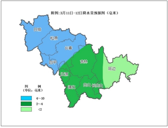 其中,11-12日,我省自西向东有一次较明显雨雪天气。白城、松原、长春、四平有小雨,北部部分地方有雨夹雪,累计降水量4~10毫米;辽源、吉林、通化、白山、延边西部、长白山保护开发区有小雨转雨夹雪,山区部分地方有中雪,累计降水量2~4毫米;其他地区有小雨或雨夹雪,累计降水量不足2毫米。