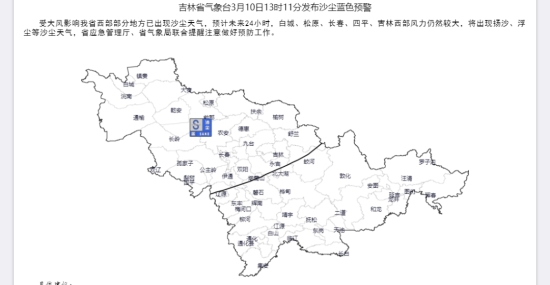 吉林省气象台3月10日13时11分发布沙尘蓝色预警:受大风影响我省西部部分地方已出现沙尘天气,预计未来24小时,白城、松原、长春、四平、吉林西部风力仍然较大,将出现扬沙、浮尘等沙尘天气,省应急管理厅、省气象局联合提醒注意做好预防工作。