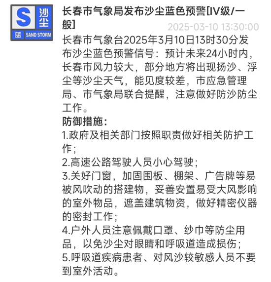 长春市气象台2025年3月10日13时30分发布沙尘蓝色预警信号:预计未来24小时内,长春市风力较大,部分地方将出现扬沙、浮尘等沙尘天气,能见度较差,市应急管理局、市气象局联合提醒,注意做好防沙防尘工作。