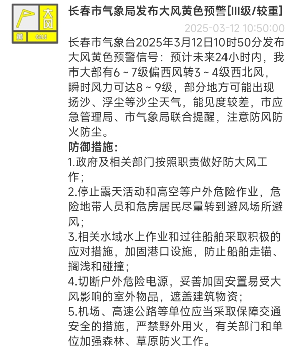 长春市气象台2025年3月12日10时50分发布大风黄色预警信号:预计未来24小时内,长春市大部有6~7级偏西风转3~4级西北风,瞬时风力可达8~9级,部分地方可能出现扬沙、浮尘等沙尘天气,能见度较差,市应急管理局、市气象局联合提醒,注意防风防火防尘。