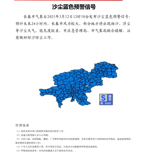 长春市气象台2025年3月12日12时50分发布沙尘蓝色预警信号:预计未来24小时内,长春市风力较大,部分地方将出现扬沙、浮尘等沙尘天气,能见度较差,市应急管理局、市气象局联合提醒,注意做好防沙防尘工作。