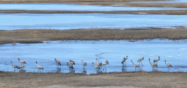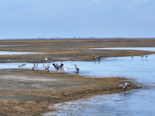 3月12日,2只国家一级保护动物白鹤携200余只灰鹤、豆雁等珍禽到达吉林省白城市镇赉县二龙涛河流域,在泛着碎冰的浅滩上梳羽觅食,东方白鹳也在鹤群上空现身,拉开全球最大白鹤种群春季停歇的序幕。