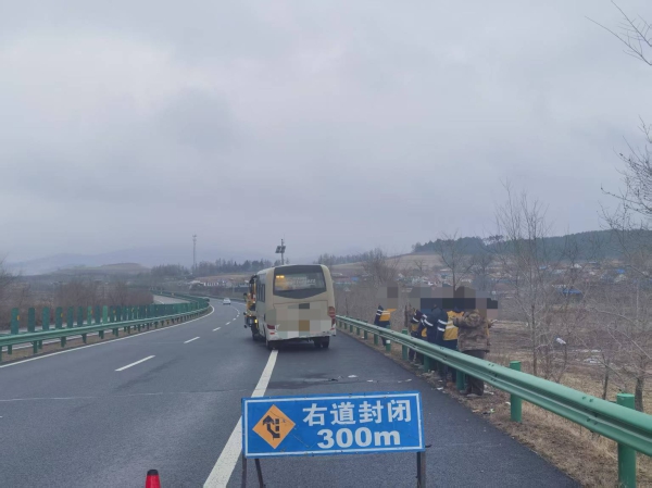 接到报警后,巡逻六大队民警第一时间抵达现场,迅速将现场15名乘客安全转移至护栏外安全区域,并快速完成安全警示锥桶布设,同时在后方200米处实施交通引导。经询问,该车系中铁集团通勤班车,由抚松出发前往沈阳途中突发故障。