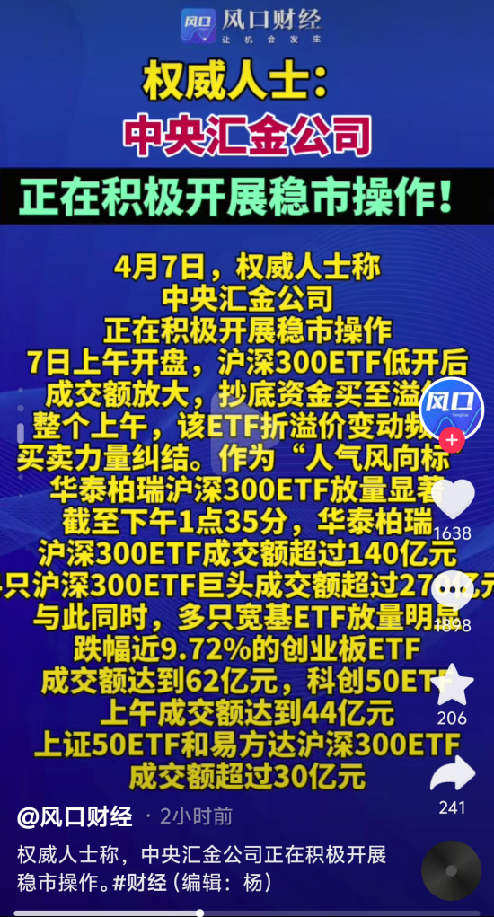 值得一提的是,4月7日,据媒体报道,有权威人士称中央汇金公司正在积极开展稳市操作。当日,中央汇金公司发布公告称,坚定看好中国资本市场发展前景,充分认可当前A股配置价值,已再次增持了交易型开放式指数基金(ETF),未来将继续增持,坚决维护资本市场平稳运行。