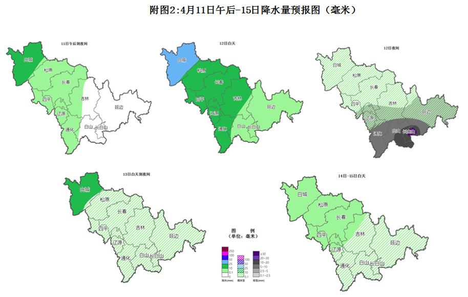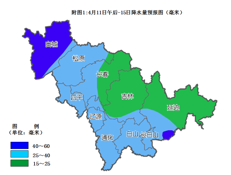 11日午后到夜间,白城小到中雨;松原、长春、四平、辽源、吉林西部、通化有小雨。