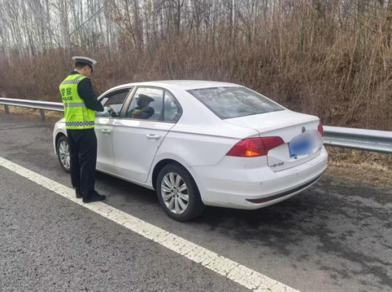 2025年4月8日15时30分许,吉林省公安厅交通管理总队高速公路延边支队巡逻六大队民警巡逻至松长高速2公里处时,发现一辆白色轿车,打着双闪停靠在路边,民警上前询问情况。