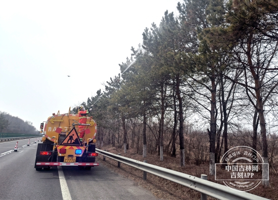 4月9日,在吉林绕城高速公路,吉高集团吉林分公司工作人员正在对高速公路两侧的樟子松等进行农药喷洒。