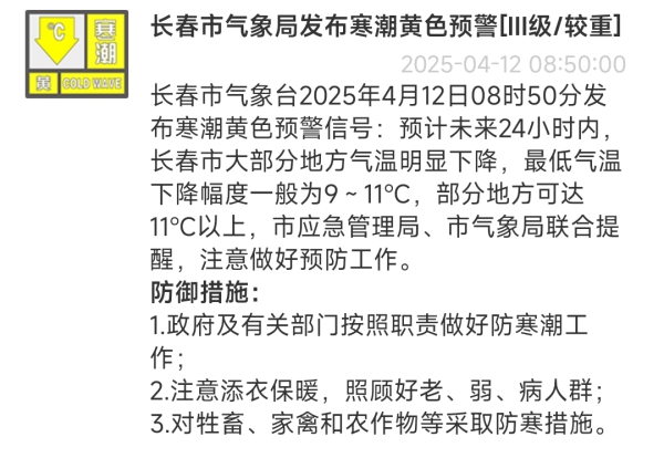 长春市气象台2025年4月12日08时50分发布寒潮黄色预警信号:预计未来24小时内,长春市大部分地方气温明显下降,最低气温下降幅度一般为9~11℃,部分地方可达11℃以上,市应急管理局、市气象局联合提醒,注意做好预防工作。