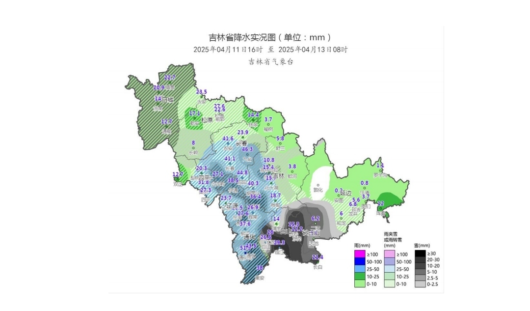 预计13日白天到夜间,吉林南部、通化北部、白山、长白山保护开发区有大雪转雨夹雪,部分地方有暴雪,延边有中到大雨,白城南部、松原南部、长春南部、四平、辽源、吉林北部有中雨或雨夹雪,其他地区有小雨或雨夹雪。