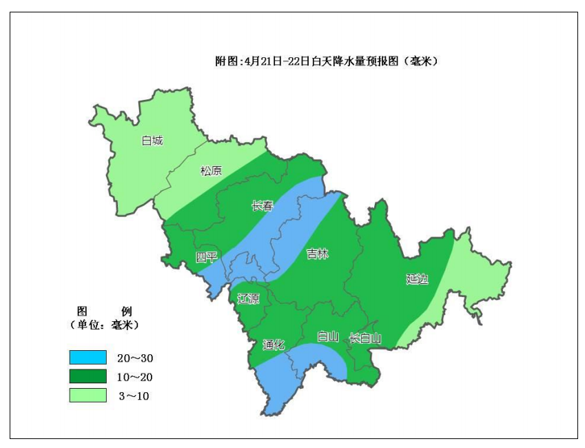 21日白天,白城、松原、长春、四平、辽源、吉林有小雨。