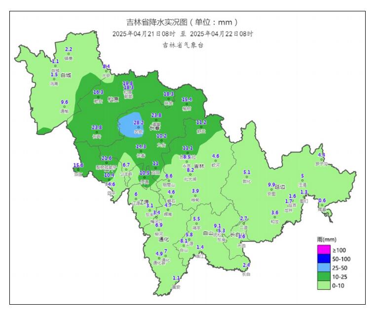 降水量前10位:农安28.2毫米、公主岭玻璃城子27.3毫米、梨树陈家24.8毫米、农安波罗湖24.7毫米、德惠23.8毫米、长岭23.8毫米、 梨树丰收23.8毫米、松原哈达山22.5毫米、乾安安字21.7毫米、双辽骆驼岭水库21.6毫米。