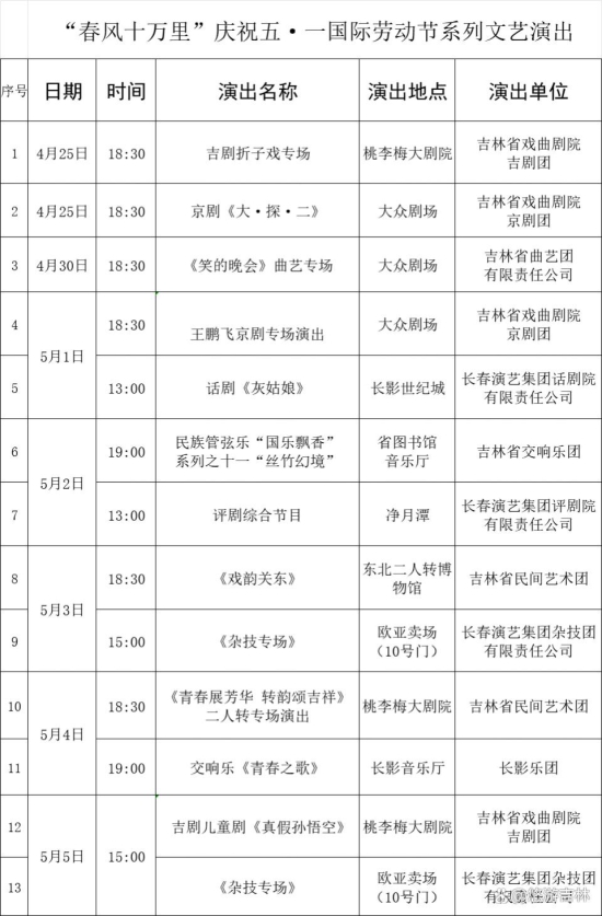 5月1日,长春演艺集团话剧院有限责任公司在长影世纪城带来话剧《灰姑娘》,重温经典童话的不朽魅力;5月2日,吉林省交响乐团在省图书馆音乐厅带来民族管弦乐 “国乐飘香” 系列之十一 “丝竹幻境”,奏响民族音乐华章;长春演艺集团评剧院有限责任公司在净月潭带来评剧综合节目,感受评剧的独特韵味;5月4日,吉林省民间艺术团在桃李梅大剧院带来《青春展芳华 转韵颂吉祥》二人转专场演出,展示东北民间艺术的热辣和欢快;长影乐团在长影音乐厅奏响交响乐《青春之歌》,用激昂旋律点燃青春火焰。