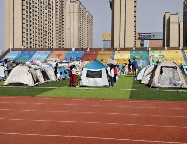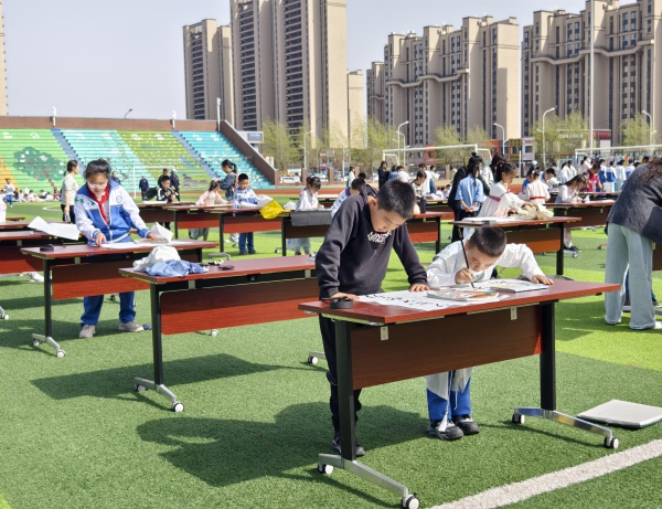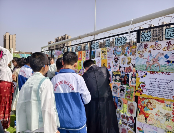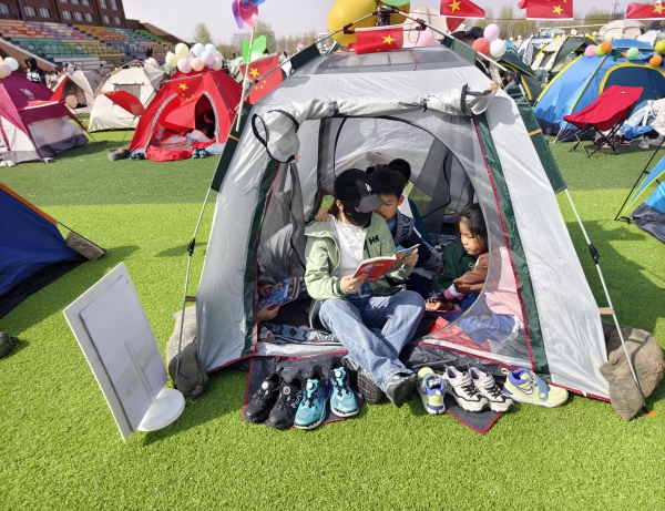 随后,户外阅读体验活动也如火如荼地开展。运动场中林立的阅读帐篷,飘动的彩色书签,斑斓的名著手抄报,巧思构建的心灵小诗……让人仿佛进入了知识的梦幻乐园。同学们或在帐篷里三五成群共读一本书,或在草坪上互换图书分享感受,或在书桌上认真执笔泼墨挥毫,全校师生参与其中,感受着阅读的快乐和交流分享的幸福。