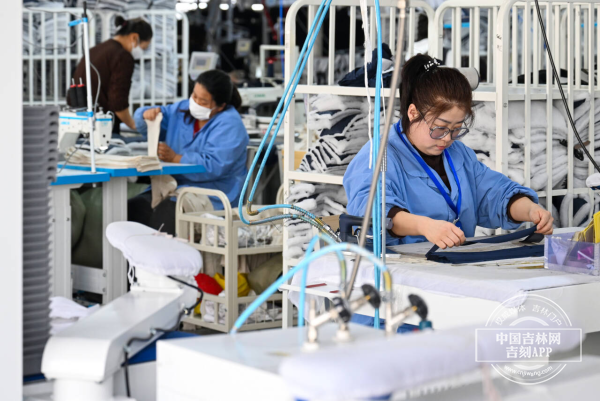 4月15日,在位于四平市的吉林实达服饰有限公司生产车间里,机械轰鸣,一排排缝纫机飞速运转,工人们正忙着裁剪、制衣……赶制订单。