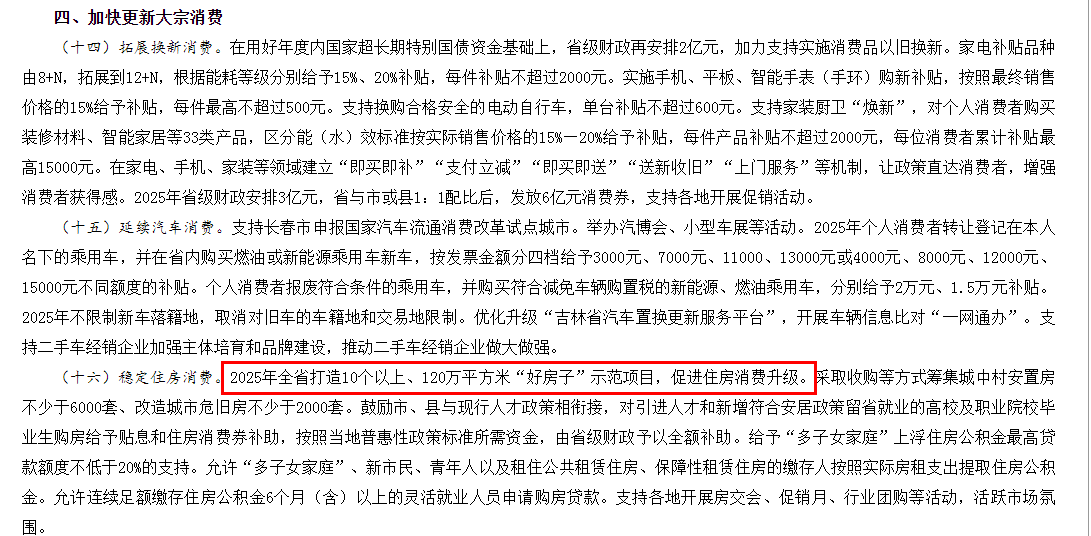 4月22日,吉林省《提振消费专项行动实施方案》中,也进一步明确了全省“路线图”:2025年将打造10个以上、120万平方米示范项目,以标杆项目带动住房消费升级,推动房地产市场从“住有所居”向“住有优居”跨越。