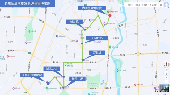 由长影旧址博物馆始发,终到伪满皇宫博物院。途经:红旗街(长影旧址博物馆、红旗街商圈)、工农大路、新民广场(南湖公园)、新民大街、解放大路、人民大街(万象城)、新发路、上海路、亚泰大街、陕西路(伪满皇宫博物院);线路全长约10公里,运营时长约40分钟,票价5元,首末车时间10:00-17:00。