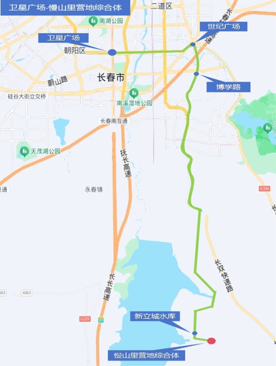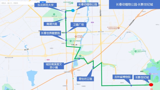 由长春动植物公园始发,终到长影世纪城。途经:自由大路(长春动植物公园)、人民大街(东北师范大学)、南环城路(长春世界雕塑公园)、东岭南街、荷香路、畅溪街(南溪里)、听溪路、溪畔街(青怡坊云琅)、和美路、临河街、天合路、生态大街、天普路、永顺路(吉林省博物院、长影世纪城)。线路全长22公里,运营时长约50分钟,票价5元,首末车时间16:00-17:00。