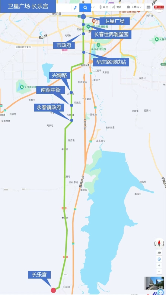 由卫星广场始发,终到长乐宫。途经:人民大街、兴博路、南湖中街、永春街、长伊公路。线路全长30公里,运营时长约50分钟,票价10元,首末车时间8:00-16:30。