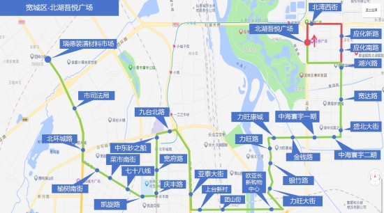 由长影旧址博物馆始发,终到净月潭公园正门,途经:红旗街(这有山、红旗街商圈)、工农大路(南湖公园)、自由大路(东北师范)、人民大街、卫星路、生态大街(摩天活力城)、博学路(迅驰广场)、飞虹路(农博园)、绿柳路(中信社区)、聚业大街、净月大街(净月潭公园正门)。线路全长22公里,运营时长约40分钟,票价5元,首末车时间7:30-19:00。