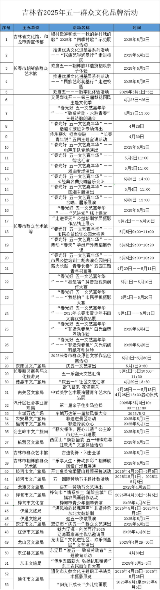 “四季村歌”“我们的中国梦——文化进万家”“春光好 五一文艺嘉年华”等品牌活动亮点突出。在“唱村歌游和龙——我的乡村我的歌”等“四季村歌”活动中,基层群众通过传唱优秀歌曲,助力乡村文化建设。前郭县等举办的“我们的中国梦——文化进万家惠民系列活动庆‘五・一’广场群众文艺演出”,以特色民族节目,让民众尽享文化乐趣。“春光好 五一文艺嘉年华”系列活动在长春盛大举行,包含诗歌朗诵会、话剧演出、戏曲专场等多种艺术形式,满足市民多样文化需求 。