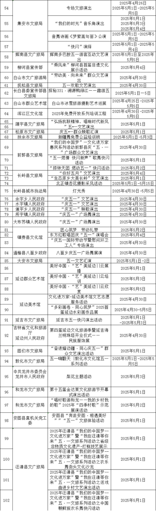 各市州活动同样精彩纷呈。吉林市的西团山“焕新盛装 五一璀璨启幕狂欢周”文旅体验活动,融合文艺演出、促销和农副产品大集,提升景区热度。另外,“吉速街舞・闪击全城”等活动,极大丰富了年轻群体的娱乐生活。四平市开展“满风神韵鼓舞声声”非遗传承东北大鼓培训和迎五一秧歌展演,传承民俗文化。白山市的“劳动美・向未来”群众文艺汇演,展现劳动者风采。延边州开展“美好中国・‘艺’美延边”云展播、云培训等线上艺术活动。梅河口市的东北不夜城系列活动,结合丝路文化节,带来独特文化体验。