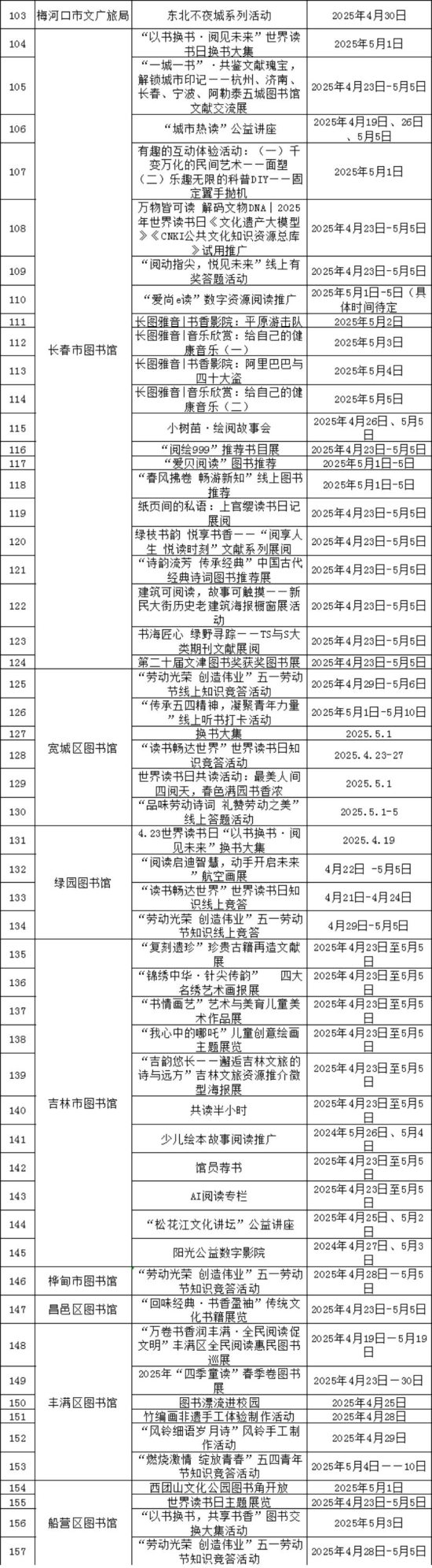 吉林省各级公共文化机构在五一假期期间,策划超200场群众文化活动,涵盖阅读推广、文艺演出、非遗展示体验等多个领域,丰富民众假期生活。