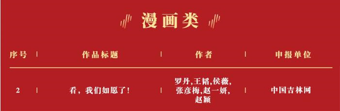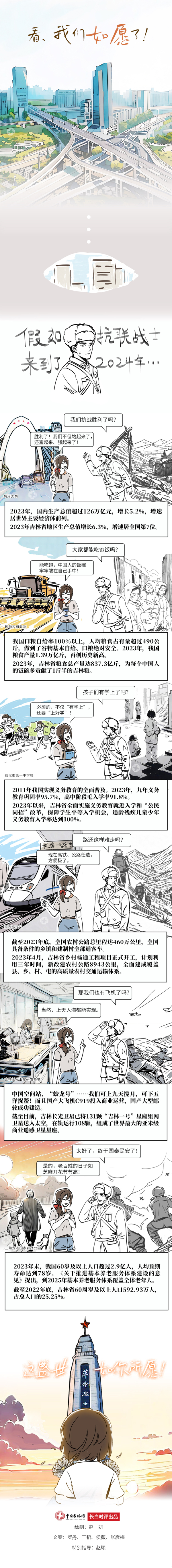 由中央网信办网络传播局、中央网信办网络社会工作局、全国总工会宣传教育部、共青团中央宣传部、全国妇联宣传部主办的2024“好评中国”网络评论大赛,评选结果已经产生,共评选出优秀文字作品50件,优秀视频作品30件,优秀漫画作品16件。由中国吉林网长白时评专栏推荐的漫画作品《看,我们如愿了!》获得优秀漫画作品奖,成为吉林省在该奖项中唯一获奖作品。《看,我们如愿了!》是中国吉林网长白时评专栏在2024年精心策划的优秀漫画作品,以时空对话的新颖形式,刻画了抗日战争时期,苦难的中国社会与抗联战士的英勇不屈,让读者在血与泪中感受到祖国今日富强的来之不易,漫画巧妙地运用了彩色与黑白做了强烈的视觉反差,给读者以强烈震撼。