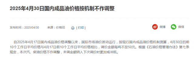 4月30日,国家发改委消息显示, 自2025年4月17日国内成品油价格调整以来,国际市场油价波动运行,按现行国内成品油价格机制测算,4月30日的前10个工作日平均价格与4月17日前10个工作日平均价格相比,调价金额每吨不足50元。根据《石油价格管理办法》第七条规定,本次汽、柴油价格不作调整,未调金额纳入下次调价时累加或冲抵。