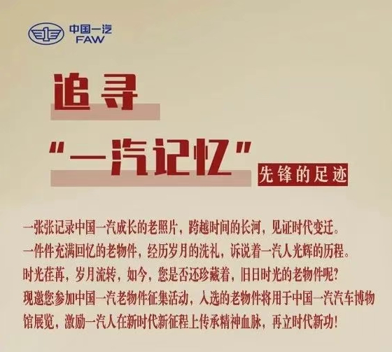 项目招标的同时,中国一汽汽车博物馆展品征集同步启动。征集内容包括中国一汽建厂以来的生产生活物品和相关影像图片,如:有纪念意义的徽章、证书、牌匾、票证、与工作相关的书信原件(复印件)、用品、传记、影像图片资料和文献等。