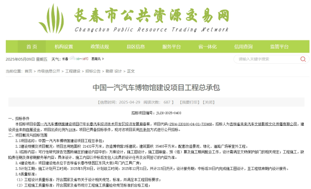 近日,长春市公共资源交易网发布《中国一汽汽车博物馆建设项目工程总承包》招标公告。
