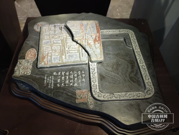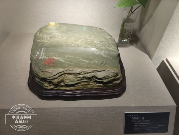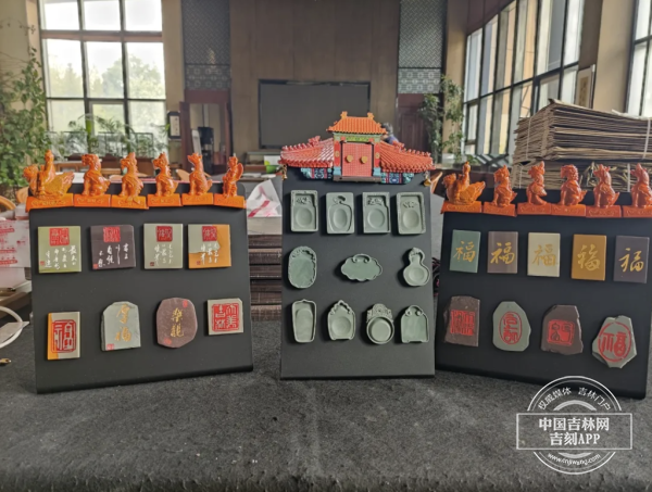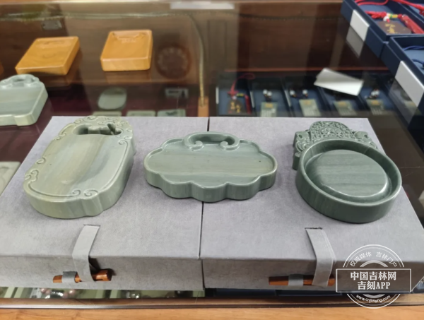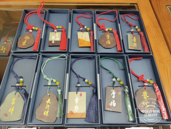 在文创产品展示区,艺术馆推出了一系列兼具艺术性与实用性的创新作品。以宫廷砚为原型等比例缩小的手把件,既保留了实用功能又便于携带;更精巧的微缩版作品仅四分之一手掌大小,兼具冰箱贴和手把件功能,还能拓印出精美小画。值得一提的是,松花玉石富含的锶元素具有强健骨骼、舒缓情绪的功效,这些文创产品还可作为按摩工具使用,实现了艺术价值、文化内涵与健康功能的完美融合。