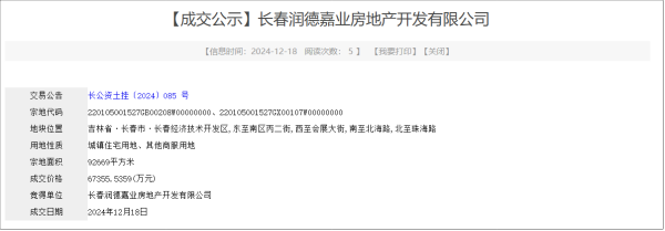 经开住宅用地被长春润德嘉业房地产开发有限公司摘得。