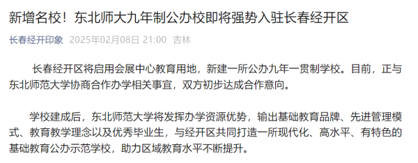 今年2月初,长春经开印象官方公众号曾发布消息:“东北师大九年制公办校即将入驻经开区会展中心地块,目前已经初步达成合作意向,但暂未说明该学校的开竣工和投入使用的具体时间。”