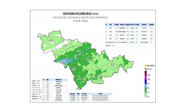 15日,中国吉林网从省气象局获悉,受高空槽、低涡切变和地面气旋共同影响,13日夜间开始,我省中西部地区出现小到中雨,四平、长春地区部分乡镇出现大雨。截至15日8时,全省平均降水量11毫米,地区分布:四平22.1毫米、长春18.8毫米、通化13.7毫米、辽源13.2毫米、吉林12.8毫米、长白山保护开发区10.0毫米、白山8.6毫米、延边6.2毫米、松原2.1毫米、白城0.7毫米。