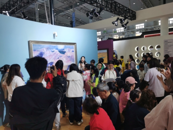 在艺术鉴赏环节,小记者们首先来到俄罗斯油画展区。专业讲解员结合长白山雪景、异域风情等作品,讲解油画创作技巧与背后故事,让孩子们直观感受艺术魅力。书法展台前,书法家协会专家现场书写,边创作边讲解运笔、结构知识,小记者们认真观察和学习。