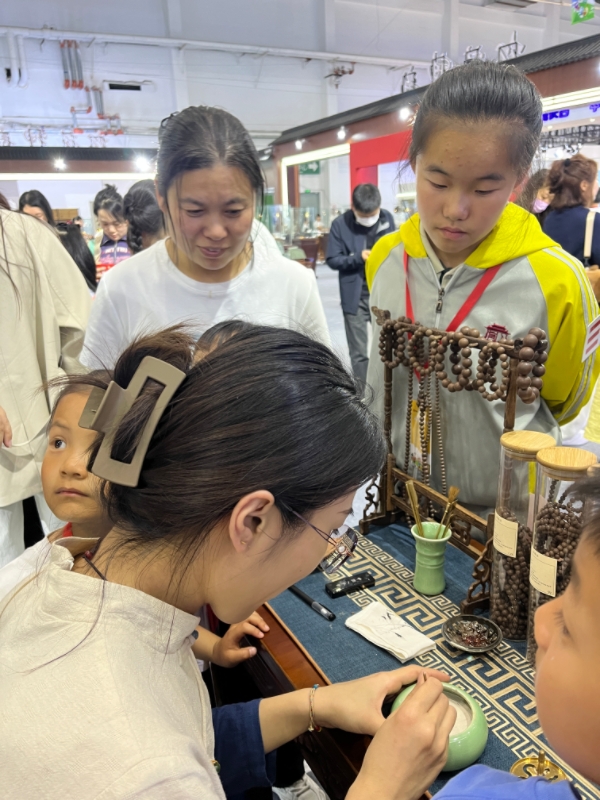 传统文化体验区充满趣味。搓香与打香篆活动中,小记者在非遗匠人的指导下制作人参香,了解传统香道文化。