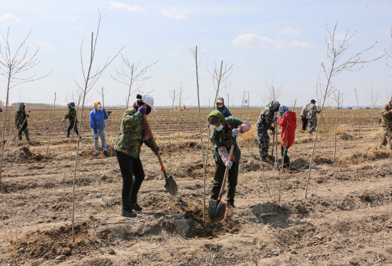 春风拂沃野,植绿正当时。五月的大地上,一片植树造林的繁忙景象。整地、挖坑、种植、回填、踩实、浇水,在吉林省白城市的大安市两家子镇的廊道绿化现场,人们忙着种植新绿,为公路筑起绿色防线。