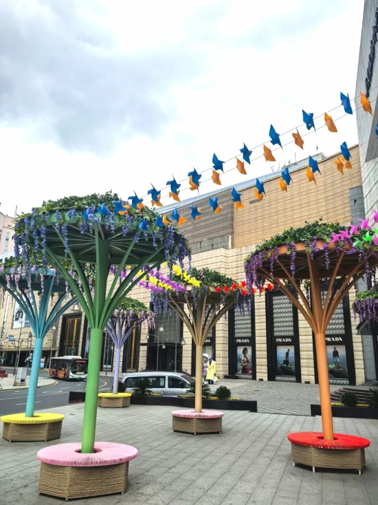 彩钢亭——梦幻花境体验中心精心挑选了9个彩钢亭,进行全方位的清洗除锈,用仿真花进行梦幻般的装饰,不同颜色的亭子搭配不同色系的垂吊仿真花卉,亭子顶盖透明玻璃上铺设仿真草坪,搭配阶梯钢骨架上装饰的仿真玫瑰,浪漫氛围直接拉满。坐凳用不同色彩的毛线缠绕,凳腿缠绕麻绳,不仅色彩美观,还能让游客拥有舒适的体验。