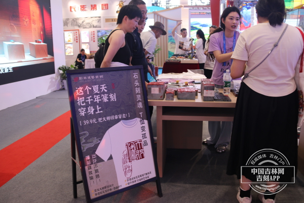 “这个夏天,把千年篆刻穿在身上”彭祖述艺术馆的特色文创,也吸引大量观众驻足。印有“富瘦双全”“大美吉林”“求实”“君子盛德”等字样的印章与白色T恤的碰撞,融合出了一件独一无二的文创T恤。如此创意十足的设计,也让购买到T恤的现场观众爱不释手。