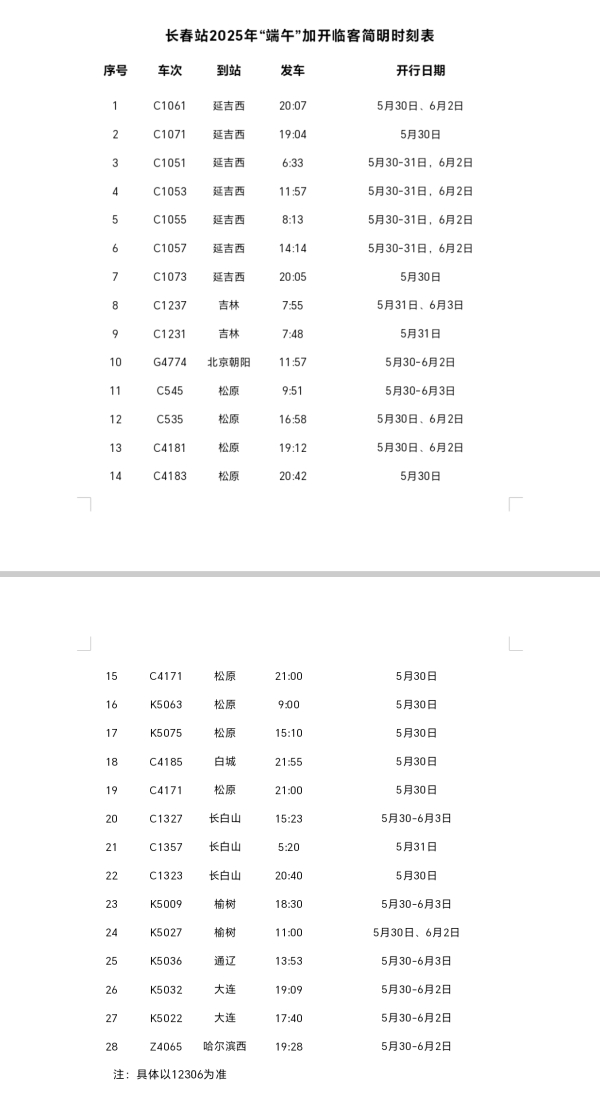 端午小长假期间,长春站客流成分以旅游流、探亲流为主,短途客流主要集中在吉林、延吉、白城、松原、哈尔滨等方向;中途客流主要集中在北京、天津等方向。为应对客流高峰,长春站计划加开北京、延吉、长白山、白城等方向临时旅客列车28列,其中延吉方向增开7列、松原方向8列、白城方向1列、北京方向1列、长白山方向3列、大连方向2列,同时采取加挂扩编、重联运行等方式提升运能,为旅客出行提供充足运力保障。车站将动态调整人工售票窗口、安检通道和检票通道数量,在长春站(本站)、长春西站、龙嘉站设置急客通道和流动引导岗,减少旅客排队时间。此外,车站候车室继续提供 “免费充电岛”“免费充电桩”,设置“自助打包台”解决旅客出行难题。