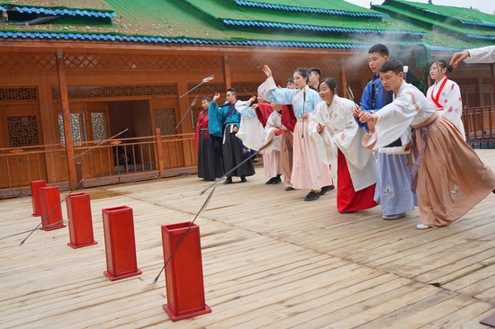 非遗匠人现场表演糖人、面人、剪纸等民俗技艺,中医药展区可品人参特调,园内更有漆扇制作、植物拓染、投壶、射五毒等丰富互动体验,让传统文化“潮”起来。文艺盛宴